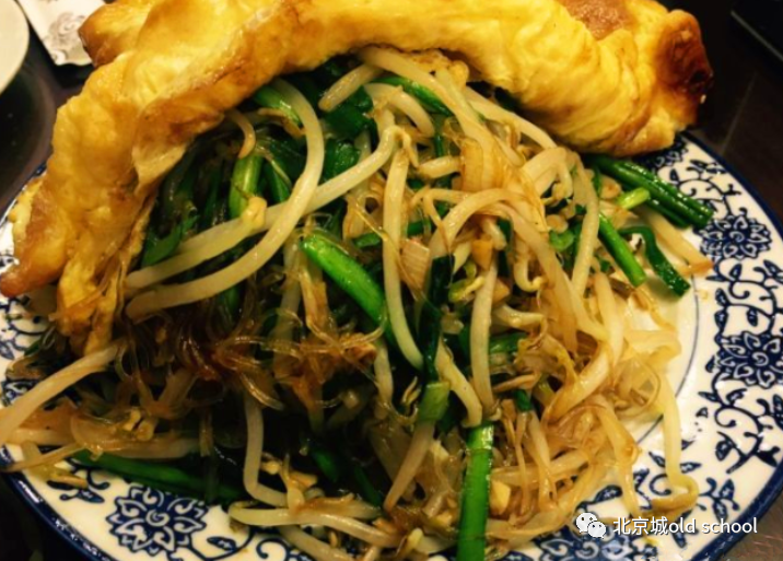 炒的时候还得翘点一寸来长的韭菜,在这个基础上还能提高档次,号称合菜盖帽儿,炒完豆芽粉丝以后,再烧油摊一鸡蛋,用不着单占盘子,直接把它盖在合菜上,这就叫合菜盖帽