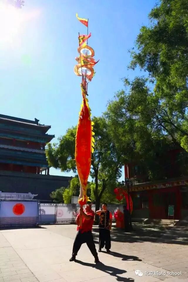 请来的都是天桥各路绝活儿的正经传人,傅文刚的祖师爷是天桥的王小辫儿和宝三儿,这可是清末民初天桥响当当的大人物,而老北京中幡正是打清宫传出来的,中幡,北京人看的是绝活儿,比方拿牙叼着,50斤的中幡就靠着一口牙,甭看就是一根儿大竹竿