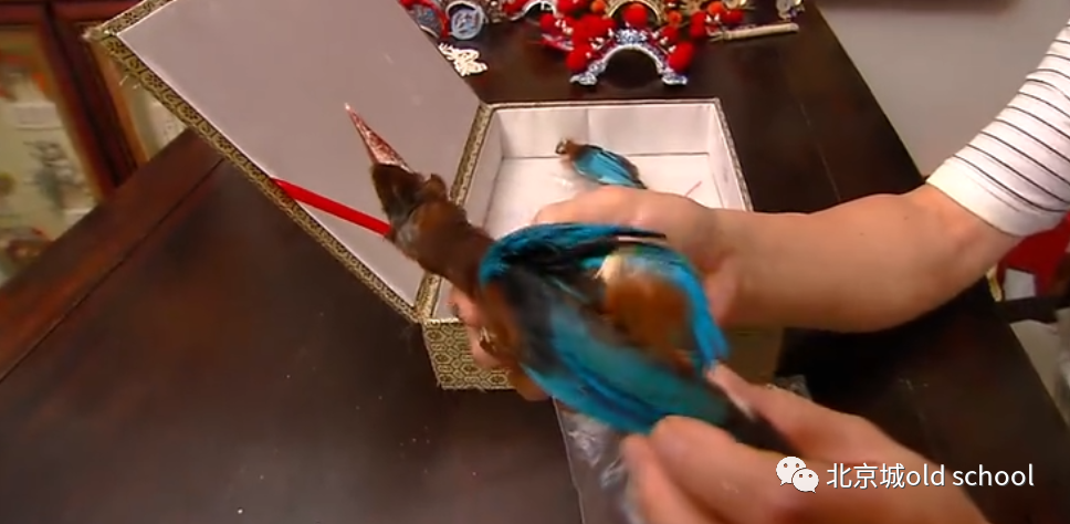 它随着光线的变化,色泽是完全不一样的,过去老北京大户人家娶妻嫁女的凤冠,不少都是点翠的,绝对属于嫁妆里最昂贵的一件,而京剧舞台上,只有名角儿才戴得起点翠的盔头,老北京盔头行里,唯独点翠是秘不外传的一项绝技,都是由专门的北京人秘密制作