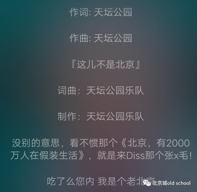 写这首歌儿的北京爷们儿,通过该曲目怒怼了之前写《北京,有2000万人在假装生活》这篇文章的小编,歌词内容十分犀利,但句句在理,没错儿,老北京的味道,早已变没,如今只剩下了数不清的京黑!
