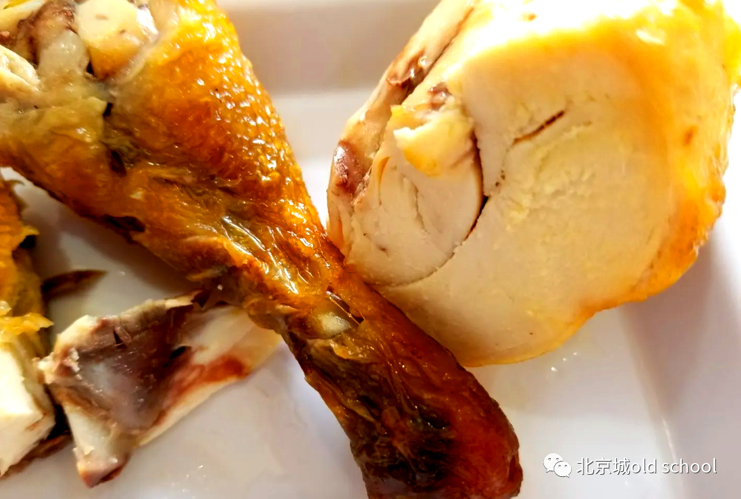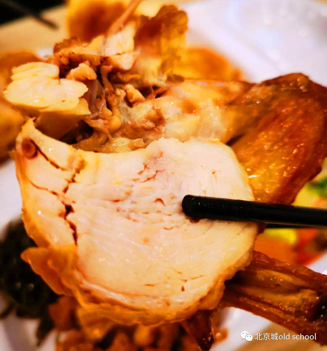 据说跟老北京烤鸭颇有异曲同工之妙,是用吊炉烤出来的,跟烧烤烤鸡不是一个套路,值得一提的是厨子烤之前,还得给鸡的每个部位注射,因为鸡身上的每个部位宽度跟厚度都不一样,直接注射进去,能让鸡肉里边儿更入味儿