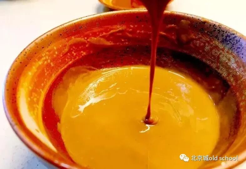 关键的配料芝麻酱大有讲究,您刚买回来的芝麻酱,通常都是纯芝麻酱,微微发苦,不能直接吃,有一个关键的步骤,咱北京人都把它称之为‘澥’舀一点儿芝麻酱放在碗儿里,一边儿兑水,一边儿用筷子,顺着同一个方向搅拌,直到把芝麻酱澥到能拉线儿,才算完事儿,有人用加盐的白水,也有人喜欢用香油