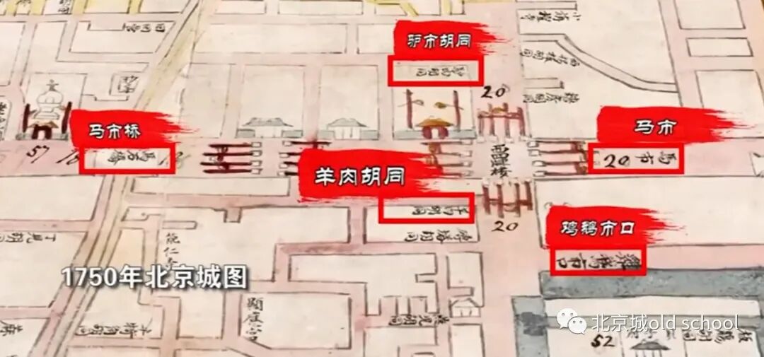 北边是阜成门内大街,因胡同中曾有羊肉集市,而在明代始称羊肉胡同,这在北京历史地图集《明万历年间北京城》上就有标注,有人说了,羊肉胡同肯定是卖羊肉了,在1750年左右绘制的地图上发现,羊肉胡同的北边,东西向横穿西四牌楼的这条街,当年叫马市,往西走还有一座马市桥。