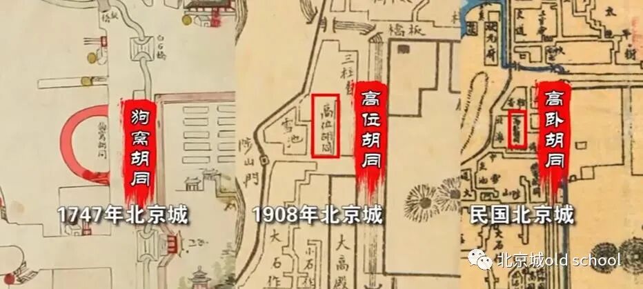 清代那会儿,这条胡同叫狗鹰胡同,因为距离皇城很近,估计这里跟皇家饲养猎犬猎鹰有关,1747年的北京城地图,可以清晰的看着这条胡同被画成了半圆形,非常形象地叫做‘狗窝胡同’到了1908年,右边标注的是高位胡同,民国以后改成了高卧胡同。