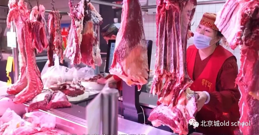不难发现,来这儿采购北京人,几乎都是当天菜,当天买,图的就是一个新鲜,见天儿上菜市场转一圈儿闻蔬果清香,看果红叶儿绿,听人声鼎沸,心情自然会跟着快乐起来,如今北京人吃饭,讲究荤素搭配,营养均衡,说完了蔬菜,咱再看看牛羊肉摊位。