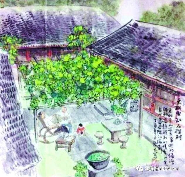 目的是遮阳,三伏天儿您照样能住院里边儿喝茶聊天,而且搭天棚还有时令,过了五月端午节,开始高搭天棚,过了八月十五中秋节,这天棚就拆了,再搭就是明年的事儿了,鱼缸,说的是院子中央,养了这么一缸鱼,闲来无事看看这金鱼儿,北京人可以调节心境,石榴树,指的是北京人在院里种树,讲究吉祥。