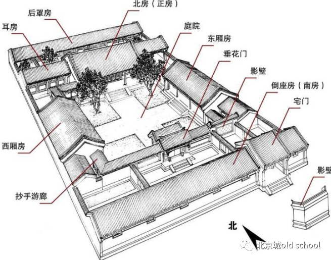 影壁旁边儿是倒座房,这是整个院子里面,最差的房子,坐南朝北,一年四季不着光,又冷又阴,它的对面儿是垂花门,这个门的四个柱头儿上有四个倒垂的莲花苞,所以叫垂花门,这个门还有一小名儿叫二门,过去老北京有个说法,说这大姑娘大门不出二门不迈。