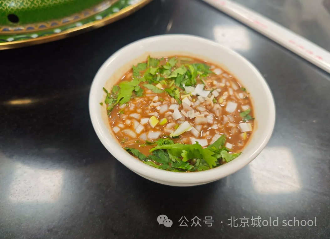 都在羊在后腿儿,简单来说,大三叉儿是羊后腿儿连着腰,小三叉儿是在腰上边儿一点儿,吃起来,大三叉儿更肥,小三叉儿则是肥瘦均匀,口感更嫩,香气更足,除了羊肉地道,蘸料也很讲究,酸口儿的麻酱,从头吃到尾,久涮不懈,它不是那种特别窜的醋味儿,而是稍微有那么一点儿酸,提鲜的过程当中,不会让您越吃越腻,比例掌握得恰到好处。