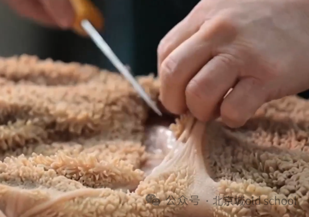 食信儿劈开了切就这个名儿,不切的话,叫算盘子儿,每个部位的口感都不一样,整个羊肚儿,可以出七个品种,分别是食信儿,算盘子儿,肚领儿,肚板儿,肚葫芦,散丹,肚蘑菇,一只羊的整挂,总共有七个不同涮的部位,再加上牛的两种,牛百叶儿+牛肚仁儿,这就是老北京人常说的九个品种。