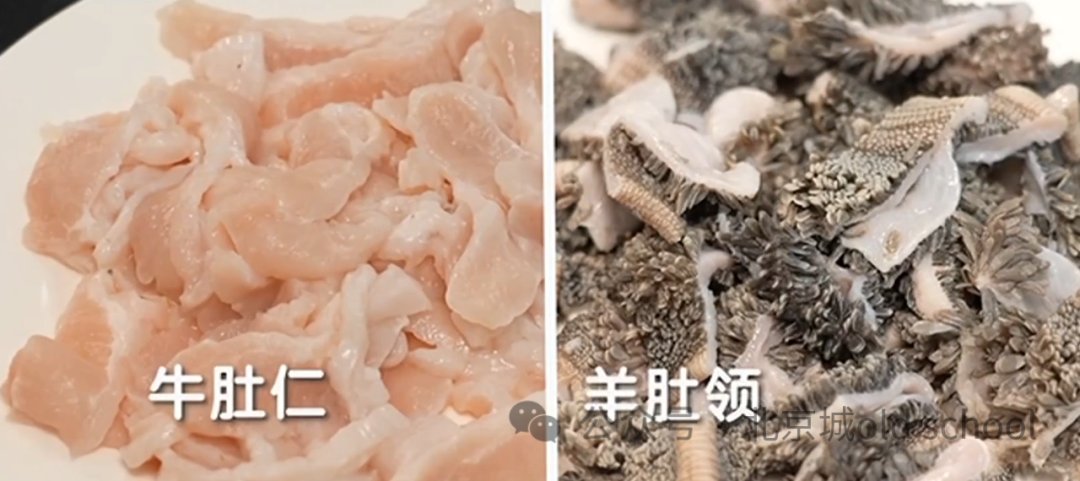 再有就是爆肚儿,一盘儿牛肚仁儿,一盘儿羊肚领儿,一黑一白,这是北京人吃肚儿的最高境界,为什么这样说,原因很简单,牛肚仁儿爽脆滑嫩,羊肚领儿有嚼头儿,哪怕您的牙口儿不好,也照样能嚼得动,并且还有奶香的口感,值得一提的是羊有四个胃,第一个肚板儿,第二个:肚葫芦,也叫金钱,第三个:散丹,最嫩的部位,最后一个:肚蘑菇。
