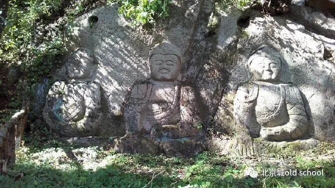 从丁香谷的景区进来,大概走四十分钟的山路就会有一个新奇的发现,六尊造像并没有扎堆儿的在一面岩壁上,而是呈阶梯状,上坡上有一组三尊,上坡下面有一组三尊,京西的石佛村老北京人都再熟悉不过了