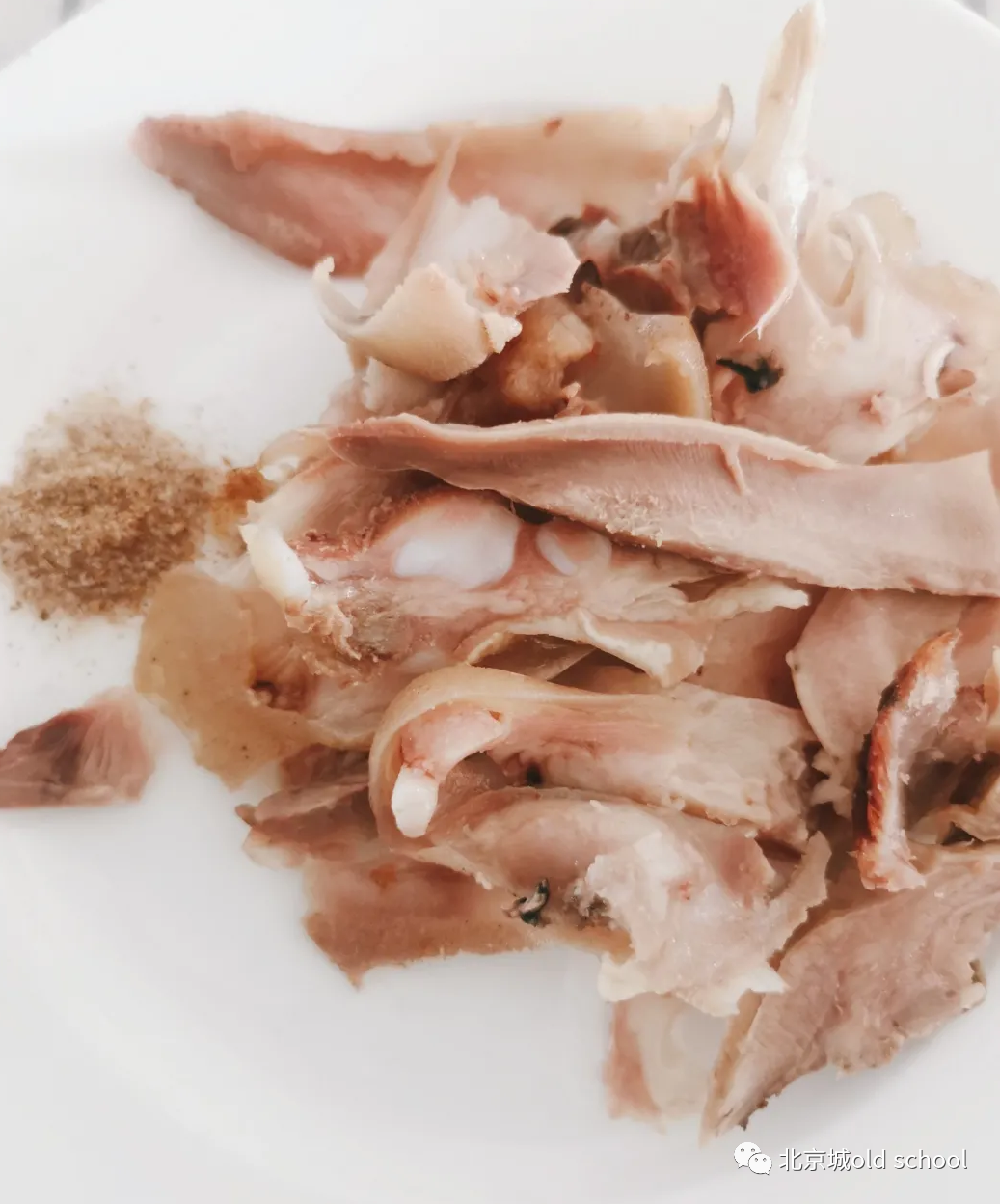 一直炒到盐粒儿发黄,出了香味儿就成,然后都擀得碎碎儿的,越细越好,北京人管这种盐叫细盐,过去卖白水羊头都离不开细盐,用完的话,您这买卖也就没法做了,所以老北京人还有这么一句俏皮话,俩卖羊头肉的回家,没有‘戏言’借了个谐音儿