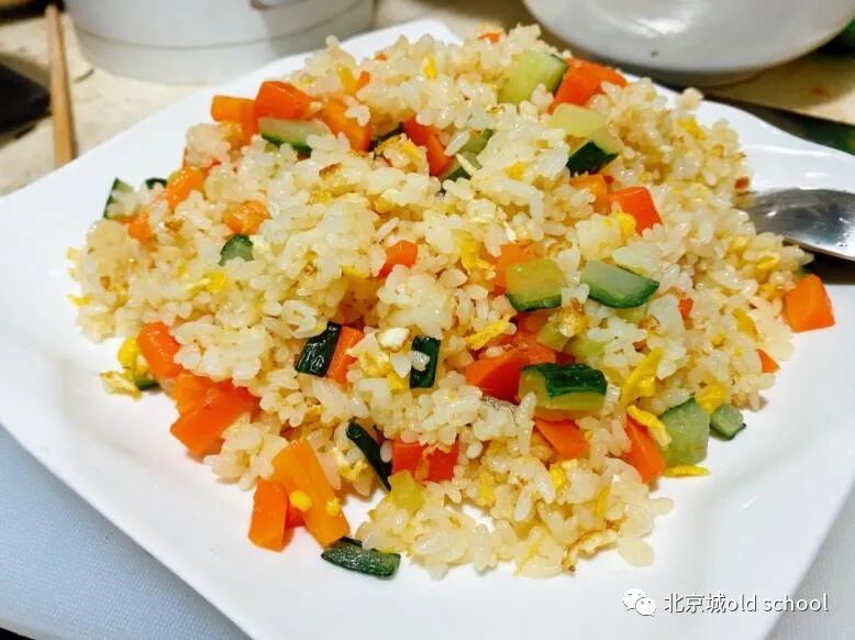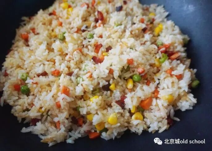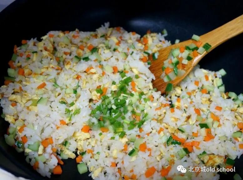 大人在厨房里就坐上锅了,把油烧热了,一把葱花搁进去,然后把剩米饭再倒里头,滋啦一声儿,来回翻炒,少来点盐,过去老北京家家户户都不富裕,所以70,80后的北京孩子吃的是炒饭,没有鸡蛋,都是简单的油盐炒饭
