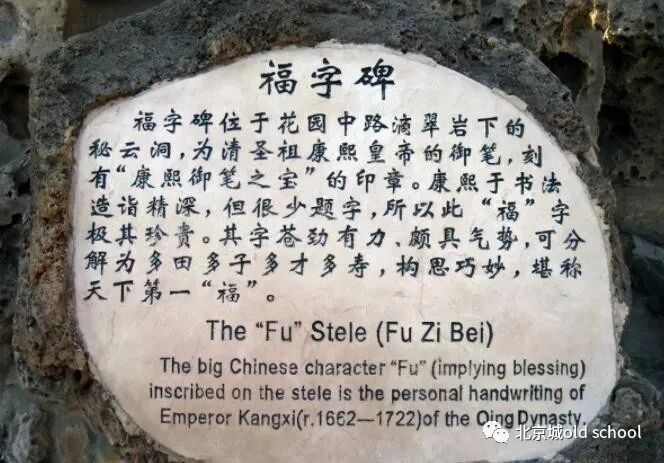 进恭王府花园转悠,您得记住八个字儿,低头哈腰,耐心排队,因为恭王府里,最值得一看的景点儿,在这儿呢,也就是恭王府的这块福字儿碑,这是康熙皇帝的御笔,不低头哈腰的话,您压根儿就进不去