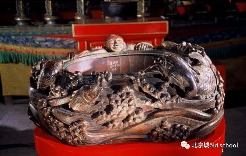 因为乾隆皇帝弘历,出生三天之后,使用的‘洗澡盆儿’就藏在法轮殿,宗喀巴像的背后,您要是不转到后边来,还真难发现,原本给出生三天的婴儿洗澡,意在祈福迎祥,俗称叫‘洗三’而眼前这个洗澡盆儿不光洗掉了弘历身上的乳臭味儿