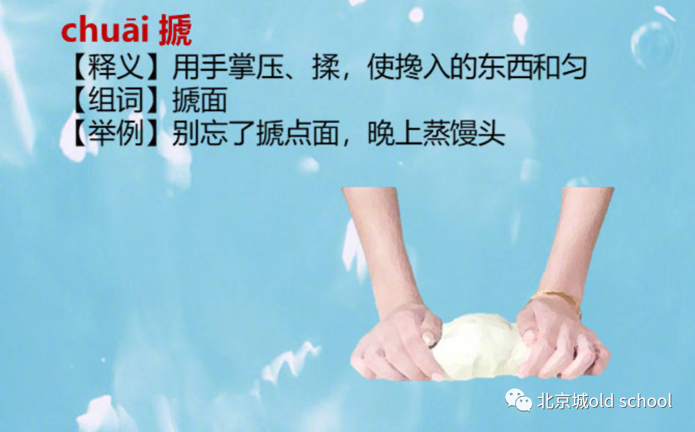 第四个字儿是搋,有不少号称京味儿小编的作者老把这个字儿写成揣,很明显这是错误的,揣这个字儿的意思装东西,把随身的物件揣兜儿里,甭丢了