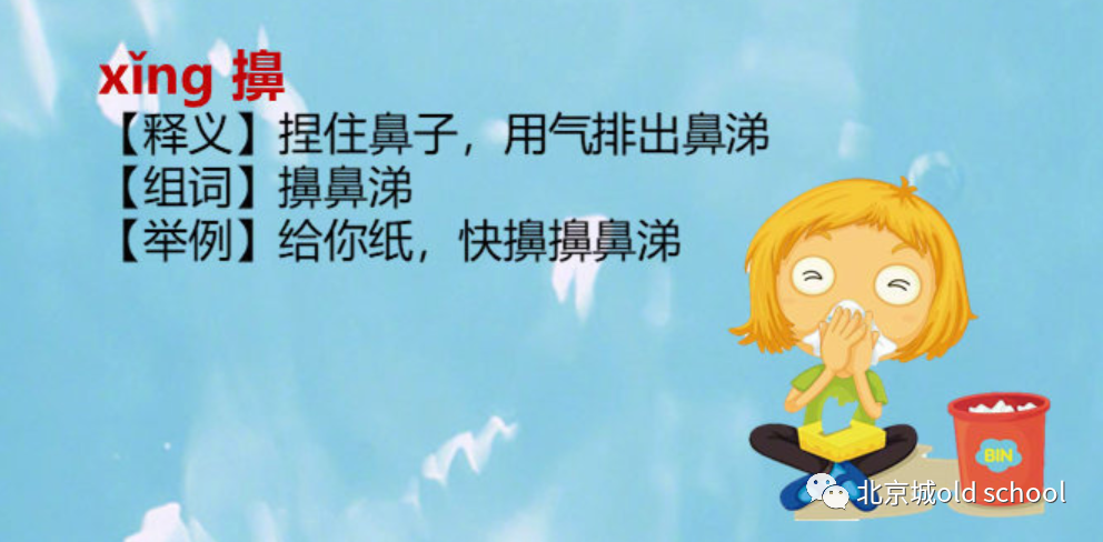 第十四个擤,说起这个字儿特别逗,其实就是擤鼻涕的意思,再简单不过了,但有人经常闹笑话,天儿冷,从外边儿进屋后,都得先擤一下鼻子