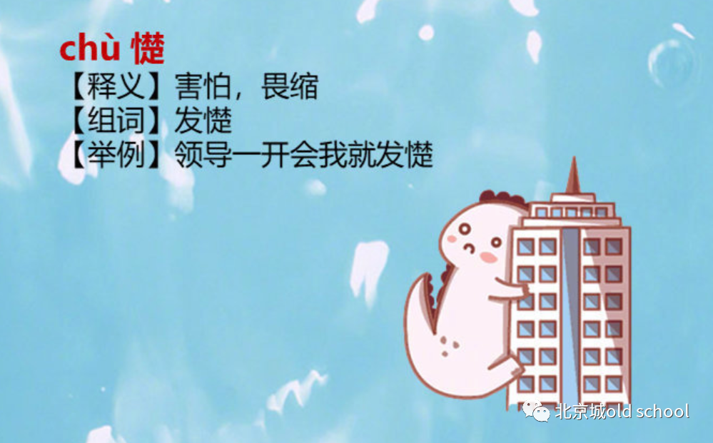 第九个是憷,很多不靠谱的文章老写成这个怵,这是错误的,用老北京话说就是砂锅带把儿,怯勺,在北京人眼中,经常会用在第一次上,比方说头回跟一群陌生人接触,心里真有点发憷,不踏实