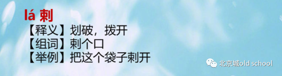 第十五个劐,这跟上边儿的剌其实是一个意思,在某件物品上劐开一口子,北京话,您的手包怎么劐开一口子?第十六个擓,吃饭的时候北京人用的最多,老家儿今儿熬了一锅鸡汤,拿勺擓一碗趁热喝喽,但写舀的人比较多