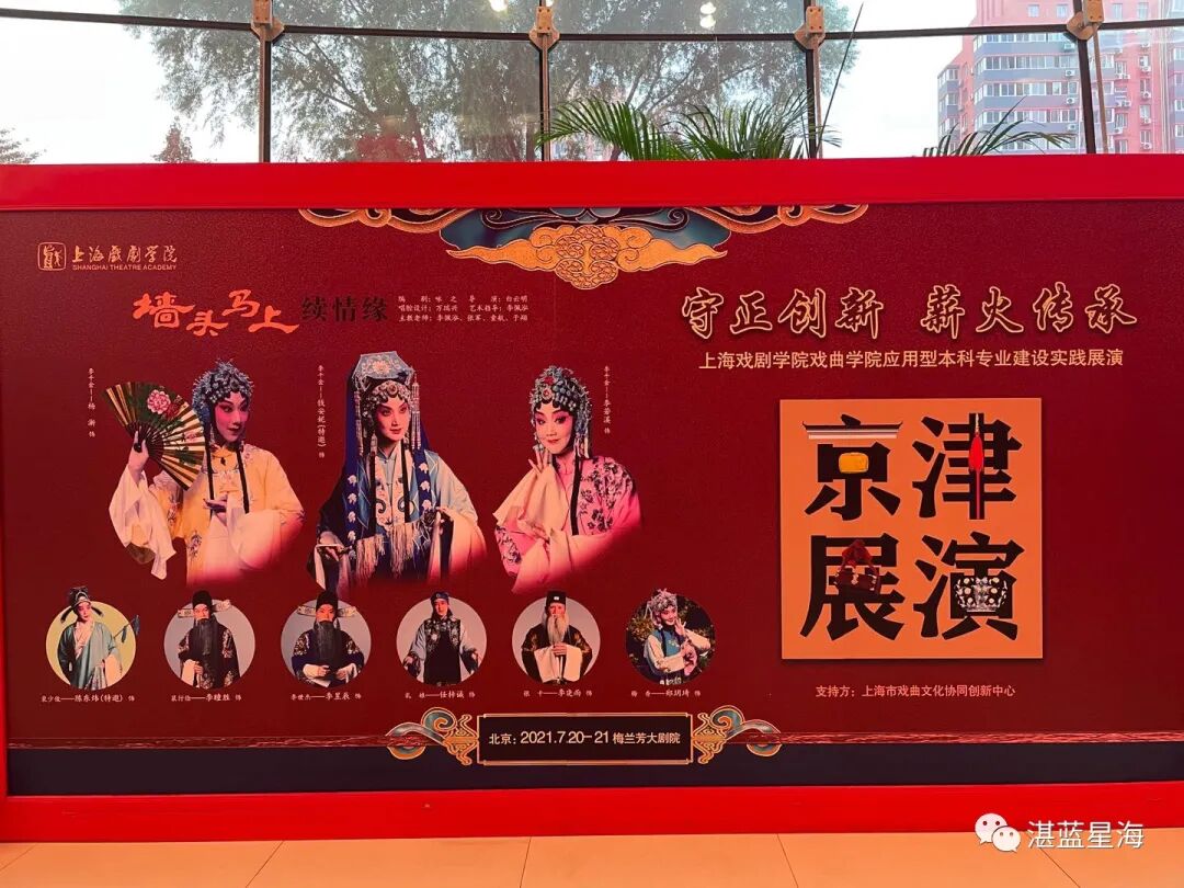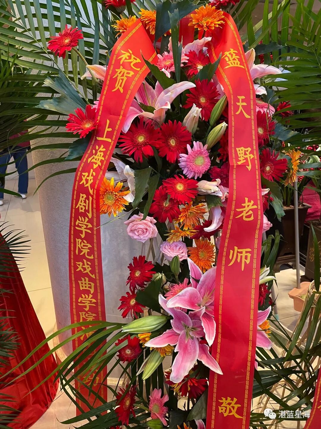 进去一看,人头攒动。原来今天晚上是上海艺术学院的学生来此演出京剧《墙头马上》等剧目。大厅内有蓝天野老师送来的花篮。