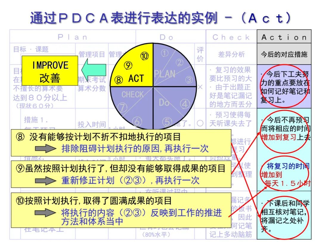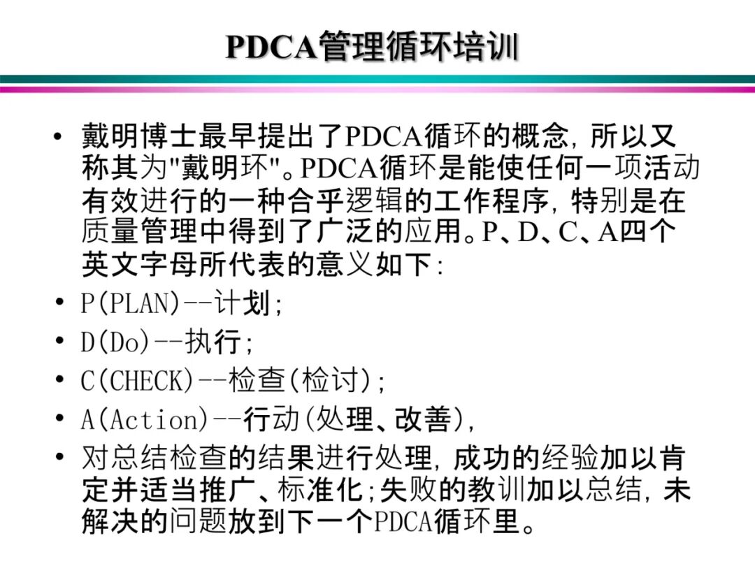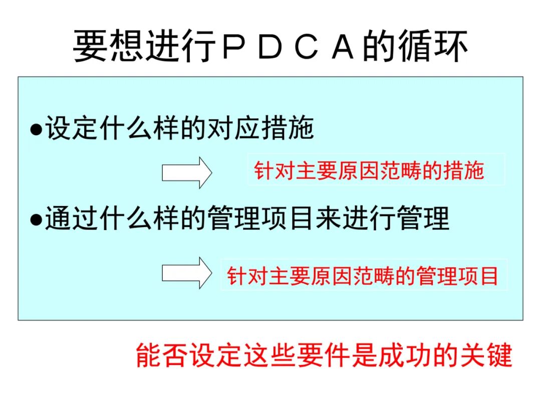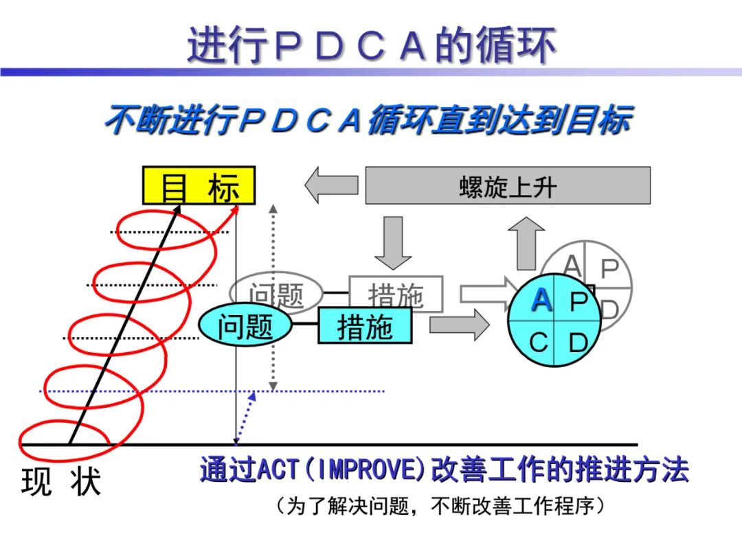 4、A (Act)处理,对总结检查的结果进行处理,对成功的经验加以肯定,并予以标准化;对于失败的教训也要总结,引起重视。