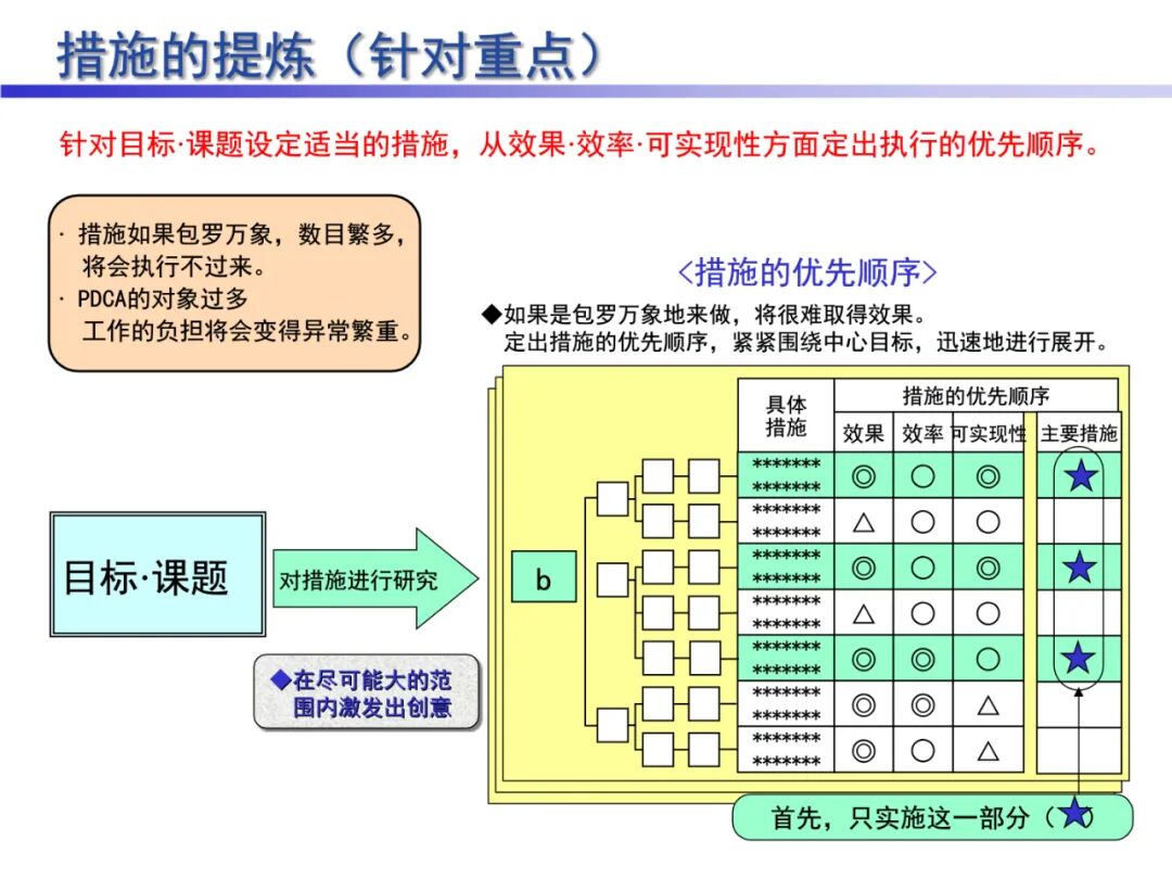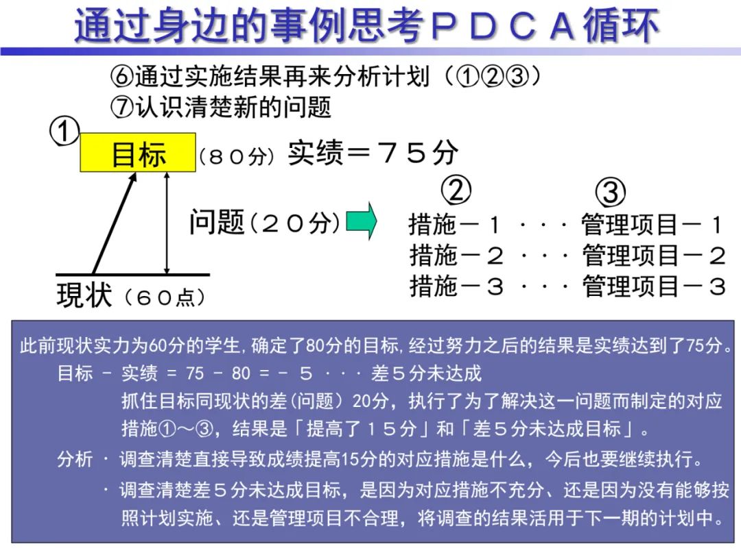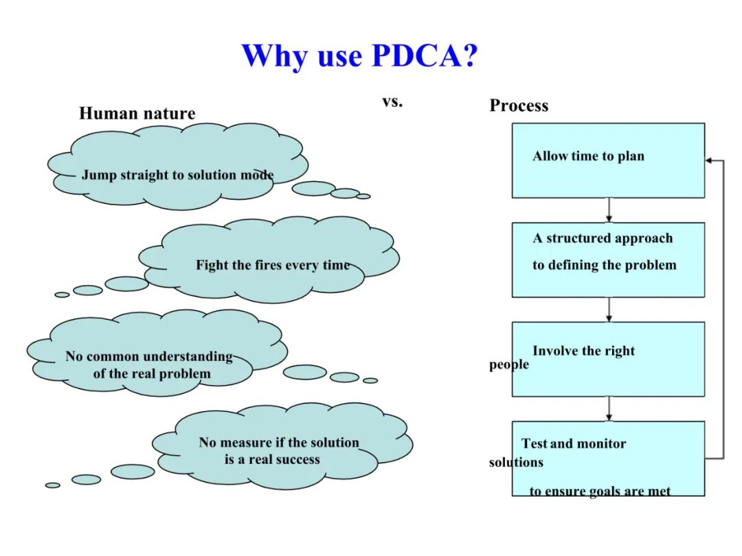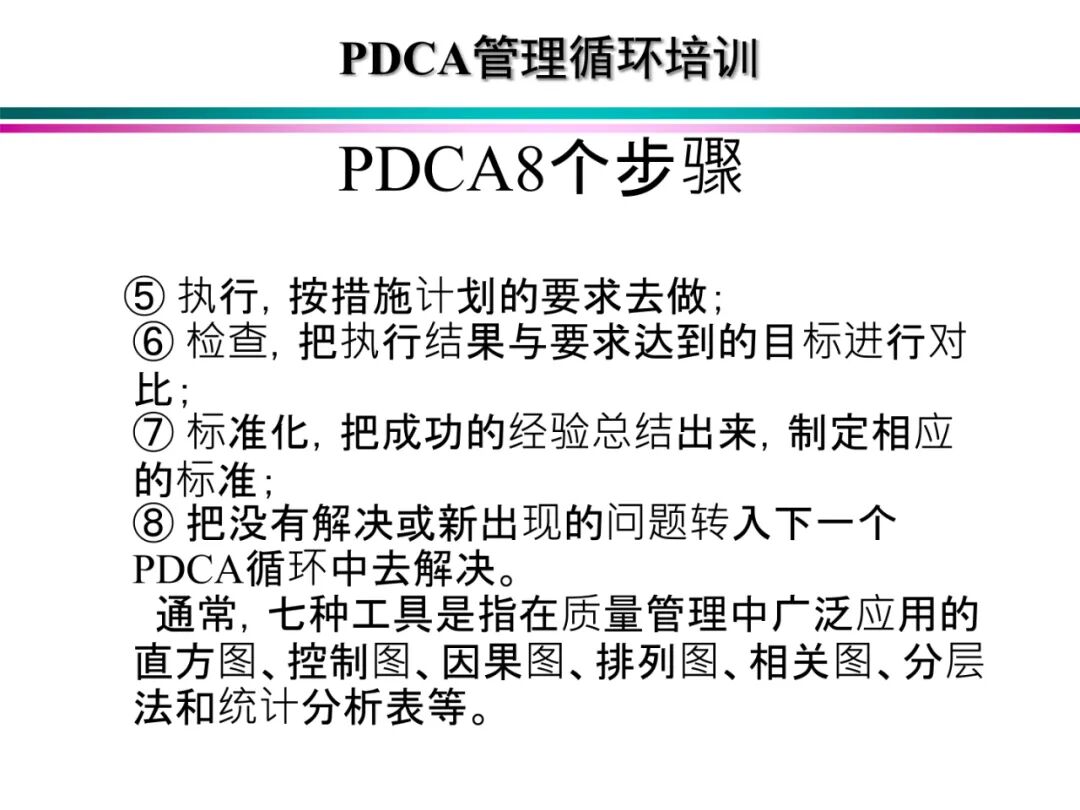 4、A (Act)处理,对总结检查的结果进行处理,对成功的经验加以肯定,并予以标准化;对于失败的教训也要总结,引起重视。