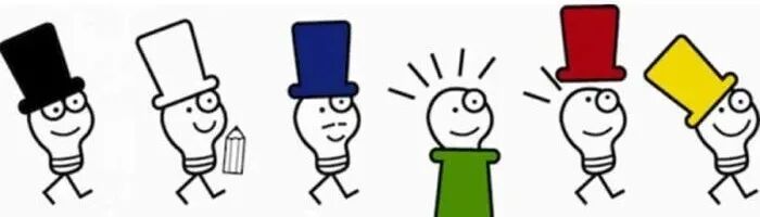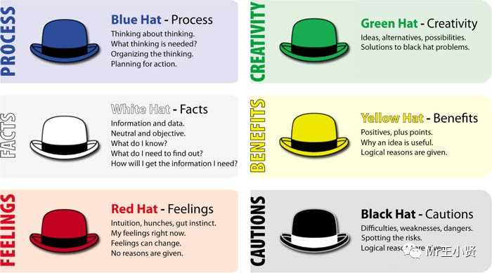 六顶思考帽分别代表对同一事、物不同的思考角度。