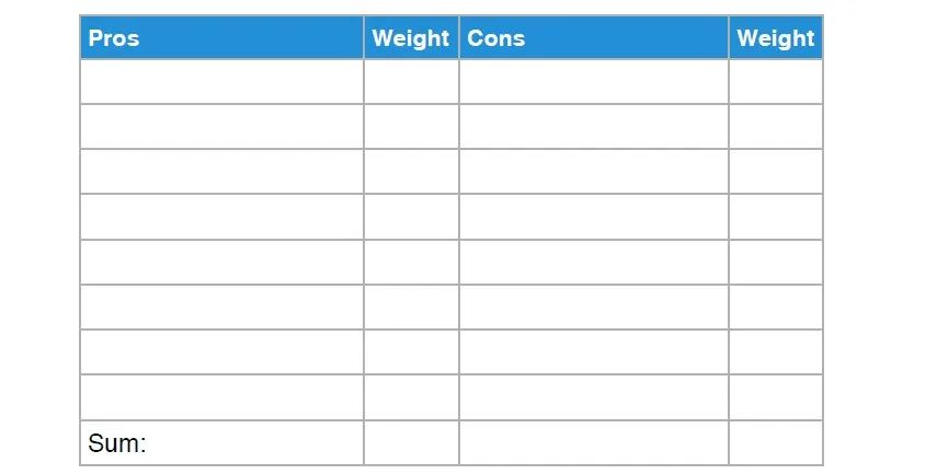 对每个利与弊进行评估和权衡,为每个因素分配权重,确定各因素的相对重要性。