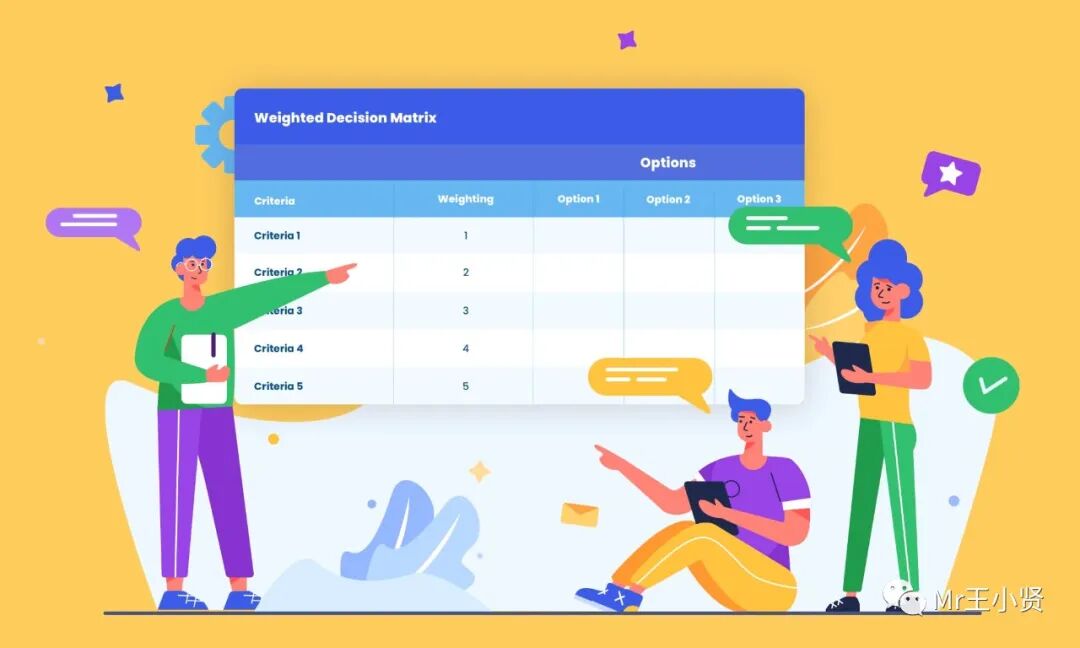 决策结果的评分标准:决策结果的评分标准是决策矩阵的核心,因此需要仔细考虑。决策结果的评分标准应该是客观、公正的,并且与决策目标相关;权重应该是合理的,以保证决策结果的准确性、可参考性。