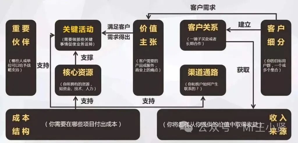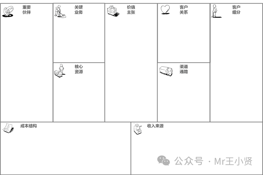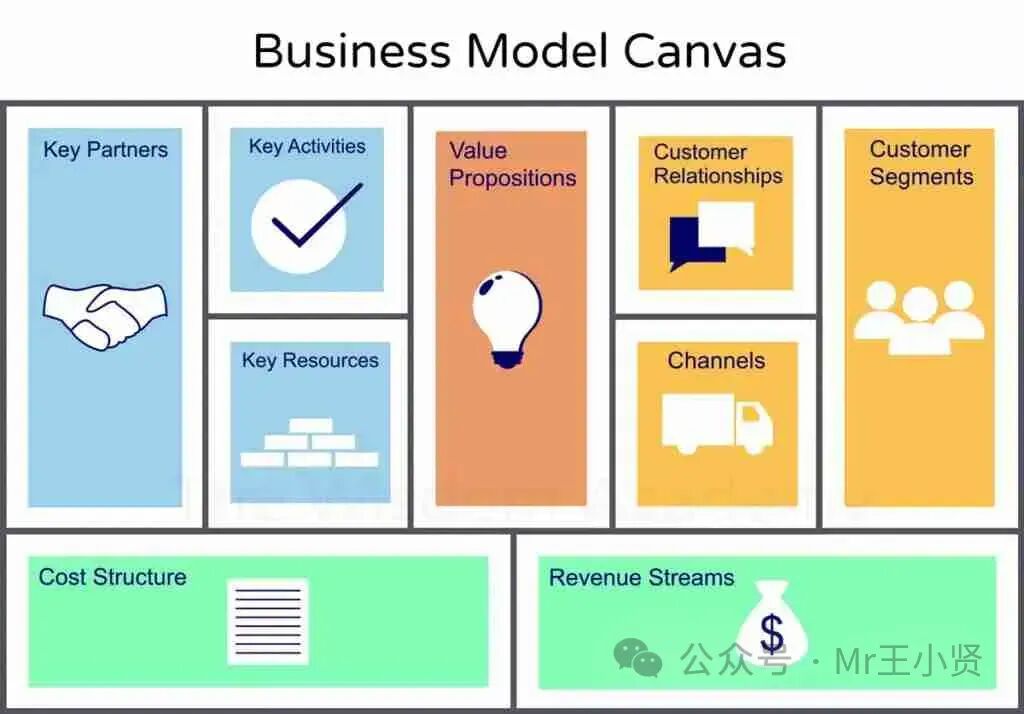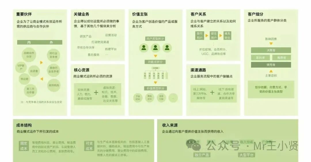 该画布以一张大纸板为基础,将一个企业的商业模式拆分为九个关键组成部分,包括: