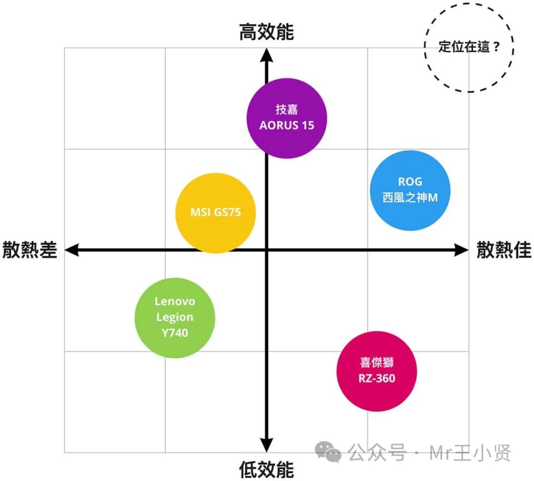 不要使用相关性较高的两个关键要素作为基准轴,例如如果把性能和价格作为坐标轴的话,可能会出现一条倾向于一条斜线的分布形态。