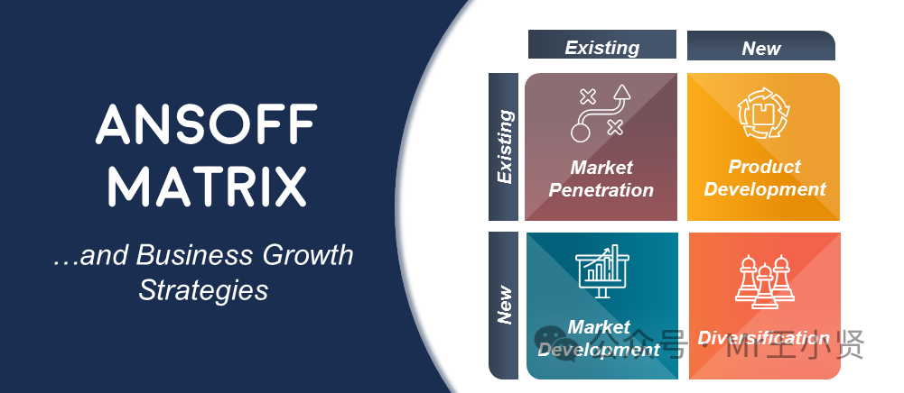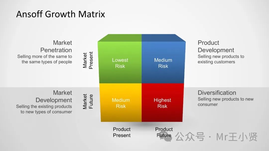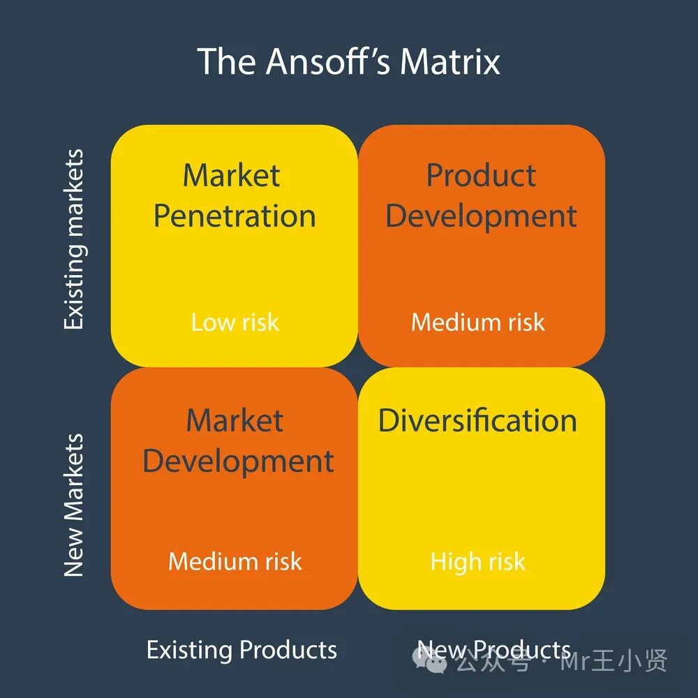安索夫矩阵是企业制定增长战略时的重要工具,通过两个轴的组合,为企业提供了清晰的增长方向。
