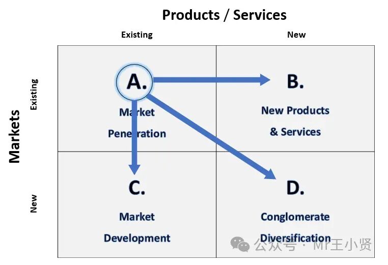 通过这两个轴的组合,安索夫矩阵形成了四个增长战略方向,分别是市场渗透、市场开发、产品开发和多元化。