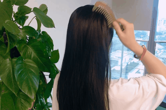 早上梳头的时候先自上而下地把头发梳通,让头发不打结,然后就是利用牛角梳的末端去按摩头皮,尤其是头顶的百会穴,以及耳后头发较多的地方。