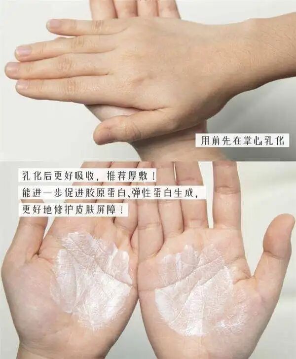 乳化就是把面霜先涂在手心,然后双手搓热,我们掌心的毛孔是比较小的,等到乳化到半透明的时候就可以按压上脸了,如果说涂一层你觉得不够滋润的话,可以少量多次的涂抹,这样用面霜的话,即便是稍微厚重一些的面霜涂起来也不会觉得油腻。