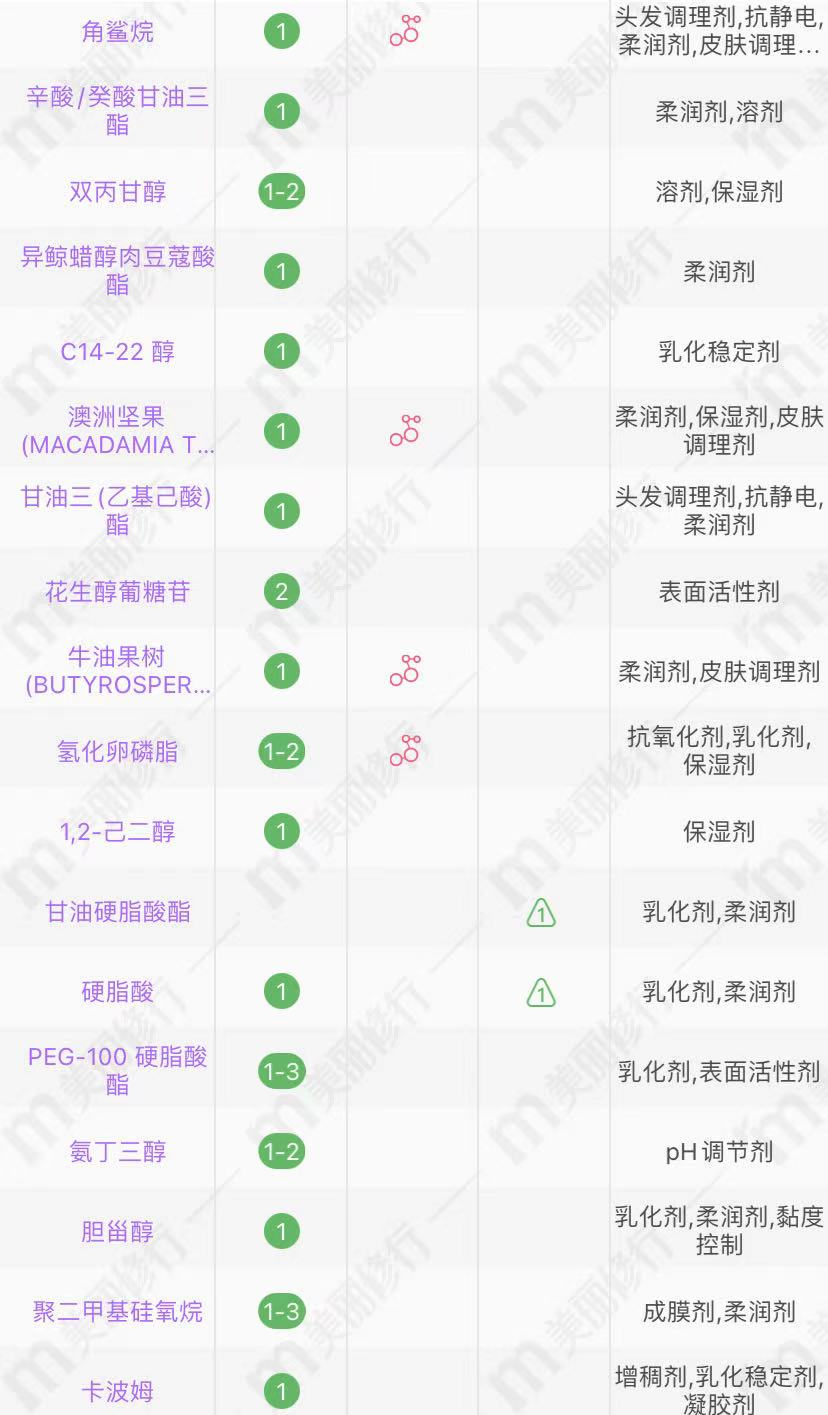 用到的保湿成分,相角鲨烷,澳洲坚果籽油,牛油果树果脂等,都是比较亲肤的配方。
