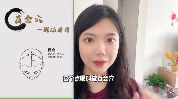 头顶正中间,大家可以从眉心一路到中分头发,再到我们头顶最顶端处这里的位置,也就是我们整个人身高最高的地方,这里有个点叫做百会,百会就是“百阳之会”,而百会经过的这一条经络叫做督脉,我们每个人都有任督二脉。
