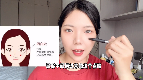 这个方法来自老祖宗的智慧——就是找到我们脸上的一个美白点。首先呢我们找到眼睛下方一点点,鼻梁中间横过来的这个点啊,这里有个点呢叫做四白穴,这个点的位置呢非常的特殊。