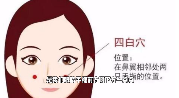 50岁左右的女性啊,记得揉开脸上的两个美容点,如果你这一圈的皮肤比较容易胖,而且还有非常明显的法令纹和末纹,那么这两个点一定要多揉开。首先第一个点呢叫做四白,是我们眼睛平视前方啊下方一点点,鼻梁中间横过来一点点点的这个点哈。