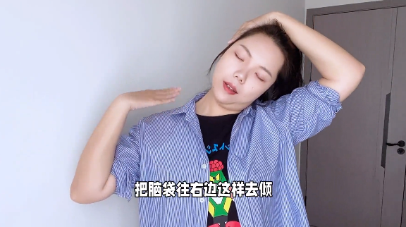 第二个方法呢,就是尽量放松我们肩颈这一块啊,先用右手抵在我们左耳朵这里啊,把脑袋往右边这样去倾,感觉到斜方肌还有后面,肩颈这一块肌肉的拉伸,背部始终是要保证挺直的,另一侧也是,往左侧这样去拉伸,感觉到整个背部这个肌肉有一种拉伸感。