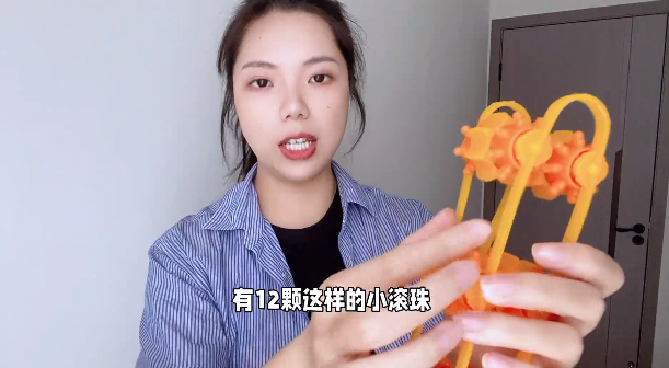 这个动作呢,也是很多瑜伽课都做的动作,我觉得对于放松肩颈很有帮助,尤其是做完之后你会觉得肩颈有一种被打开的,很温和的感觉卷,第三张呢就是拿出我们这个滚珠按摩绳,有12颗这样的小滚珠,还有中间这个滚轮,这样组成的。