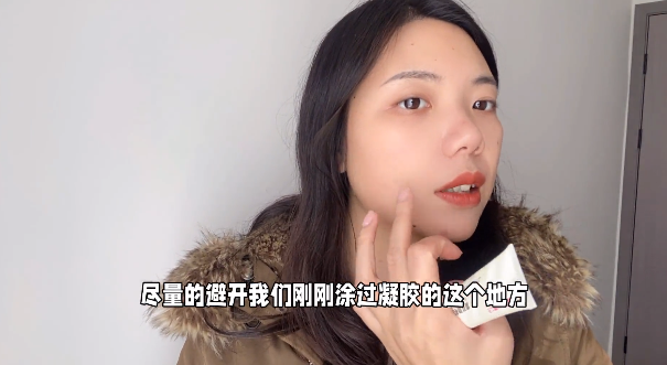 如果说你之后的护肤步骤呢,就是涂水乳霜,那么你只需要在其它的地方涂涂上就可以了,尽量的避开我们刚刚涂过凝,胶的这个地方,这些地方呢就专门就涂凝胶就可以了,其它的护肤品就不需要用了,还有一个方法呢,如果说你之后还是需要化妆的,那么你可以在,涂了这个凝胶之后,先等待几分钟,等待它摸上去有一种沉膜的那种感觉,就不是这种黏黏腻腻的啊,之后呢,你再用粉饼或者粉,扑这样轻轻的压在你需要化妆的地方就可以了。