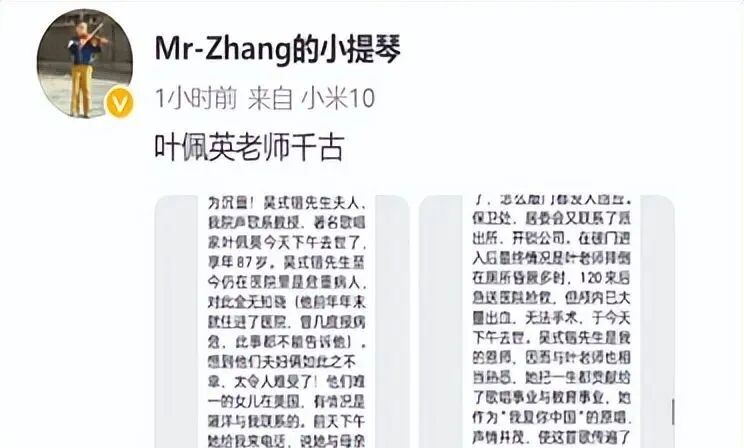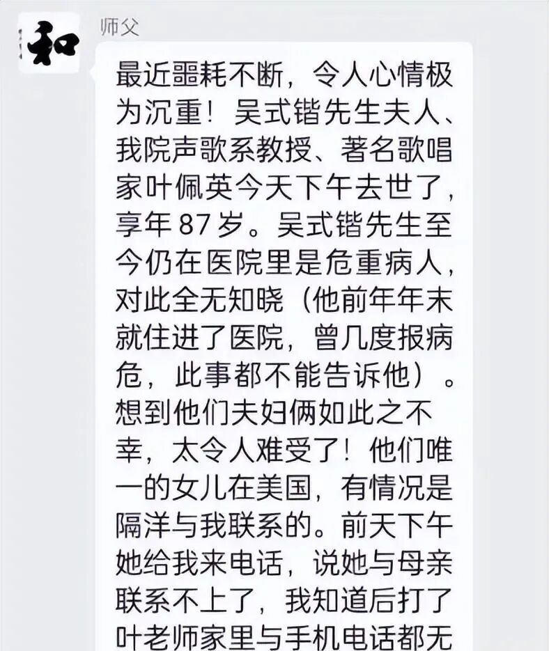 这次叶佩英老师离开了我们。叶佩英老公的徒弟在社交媒体上,跟大家讲述了师母去世的一些细节