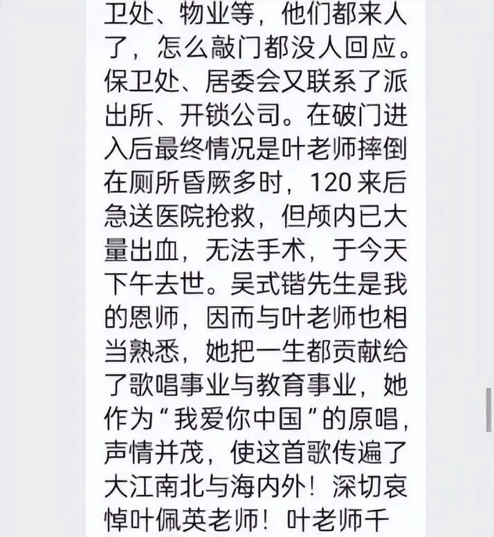 因为联系不上,寻找其他人的帮助打开了母亲的房门,叶老师昏厥在厕所旁边,错过了最佳的救治时间。