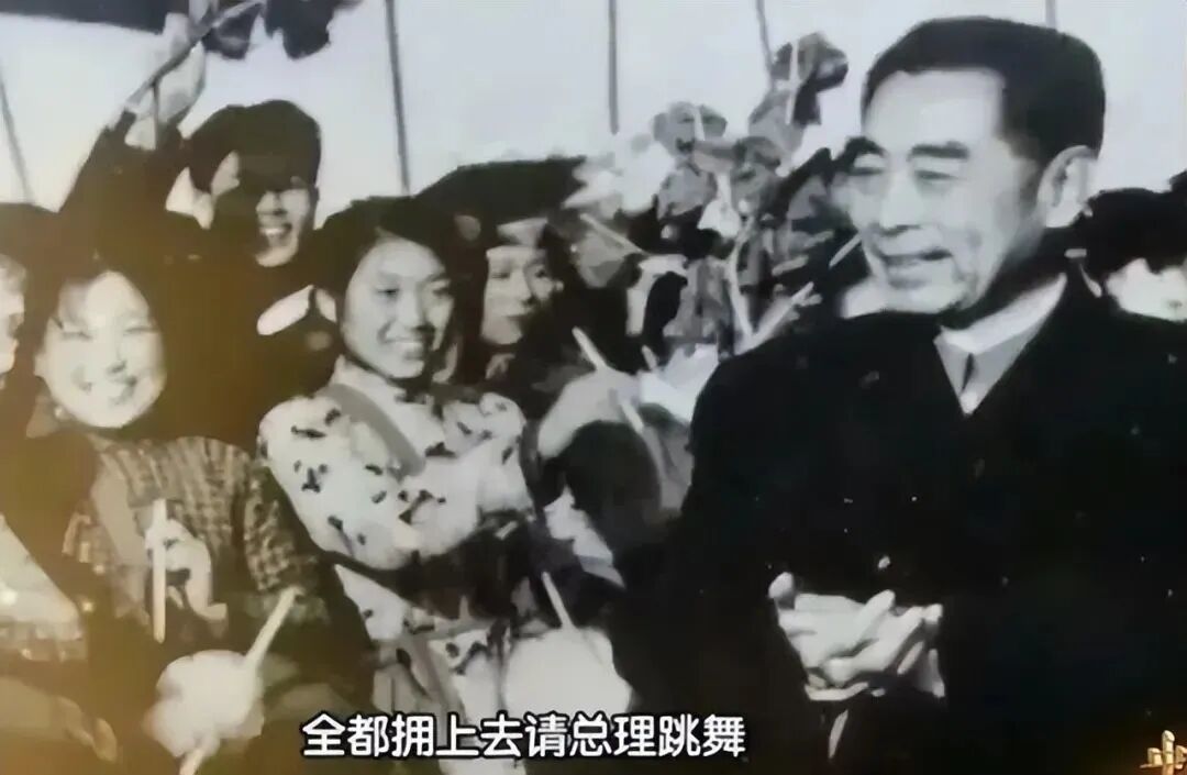 到了跳交际舞环节,所有女生都激动地围上去请周总理跳舞,