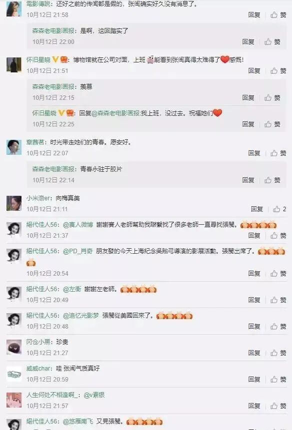 众网友也表达了对张闽的关切。@电影传说:还好之前的传闻都是假的,张闽确实好久没有消息了;@森森老电影画报:是啊,这回踏实了;@怀旧星晓:博物馆就在公司对面,上班。能看到张闽真得太难得了,感慨;@绝代佳人56:谢谢赛人老师帮助我联系找了很多老师一直寻找张闽;@绝代佳人56:张闽从美国回来了;@威威char:哇,张闽气质真好;@绝代佳人56:又见张闽。