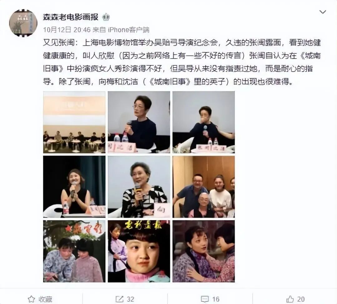 对此活动,网友@森森老电影画报作了介绍,其中尤其谈到了张闽:“又见张闽:上海电影博物馆举办吴贻弓导演纪念会,久违的张闽露面,看到她健健康康的,叫人欣慰(因为之前网络上有一些不好的传言)……”