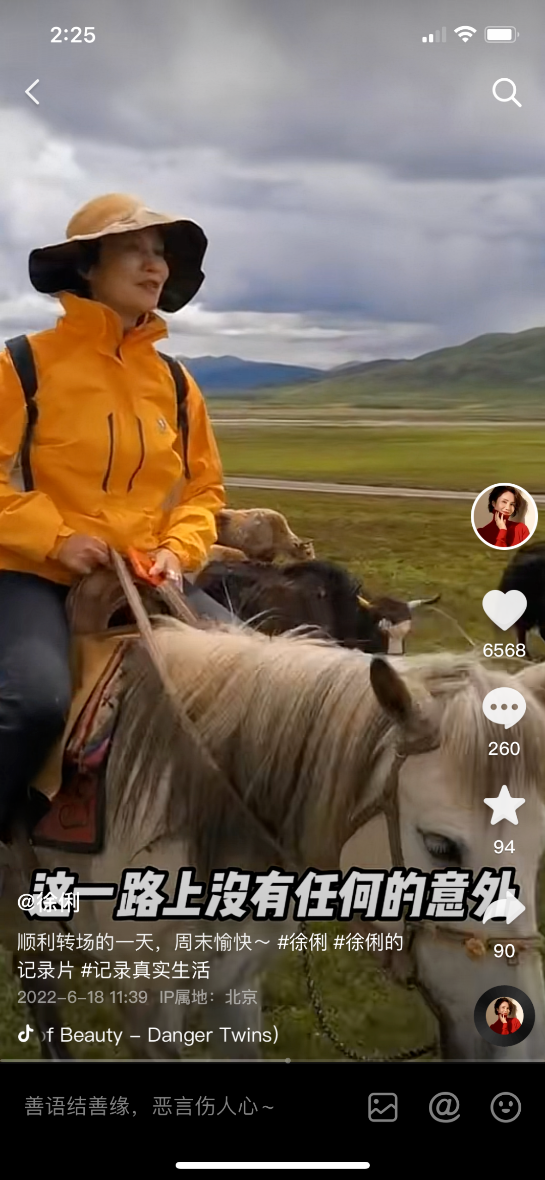 6月18日,徐俐在自己的抖音 Vlog中用藏语“扎西德勒”和大家打招呼,这是他们在拍摄纪录片转场时随手拍下的。视频中,她骑马慢行于藏民的牛群中,“我们已经快到达第一个宿营地了。”