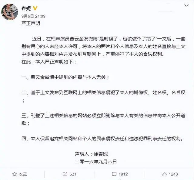 在曹云金爆料后,春妮公开发文声明,称自己与曹云金的暗示无关。