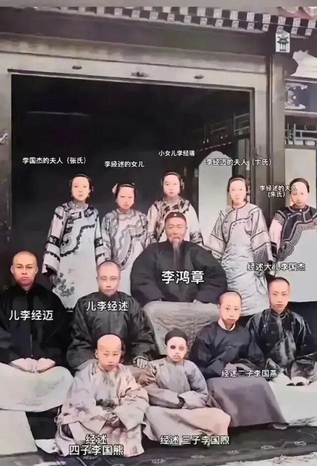 在全家福,李鸿章作为一家之主居中央,两个儿子坐在他的左边,而且那个凳子比李鸿章的矮了不少。几个孙子在最前面按照长幼秩序围地而坐,而家里的妇女则站在最后面,没得坐。(思想者书店编辑)